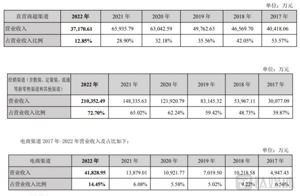 目前盐津铺子的销售渠道逐渐发生变化,直营商超渠道的营收占比在逐年降低,据2022年年报所示,部分商超系统和门店卖场2021年已转场由经销商经营。如此一来,经销渠道逐渐成为了盐津铺子的主要营收来源。2022年,经销渠道实现营收21亿元,占营收比重超过7成。
