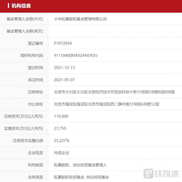 2021年12月13日,实控人为雷军、注册资金达11亿元、由小米科技有限责任公司100%控股的小米私募股权基金管理有限公司正式完成了在中基协私募管理人的备案登记。