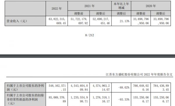 年报显示,东方盛虹2022年实现营业收入约638.22亿元,同比增长21.13%(调整后);归母净利润约5.48亿元,同比下降88.02%(调整后)。即便这样,还要靠处置非流动资产、政府补助“美化”财报。2022年东方盛虹实现的扣非后净利润为8506.94万元,同比下降93.33%(调整后)。