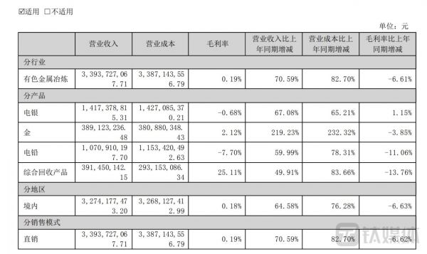 具体来看,2022年,金贵银业营业成本为33.87亿元,同比增加82.7%,其中金、电铅、综合回收产品营业成本增速均高于营业收入增速,从而导致相关产品的毛利率有所下滑。