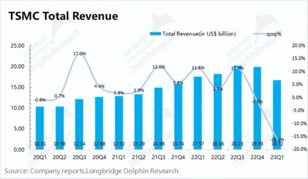 台积电在2023年第一季度实现营收167.2亿美元,位于业绩指引区间下线(167亿~175亿美元),季度营收环比继续回落。本季度收入环比下降16.1%,季度收入的变化主要随着半导体景气度下行,公司晶圆出现量价齐跌的情况。