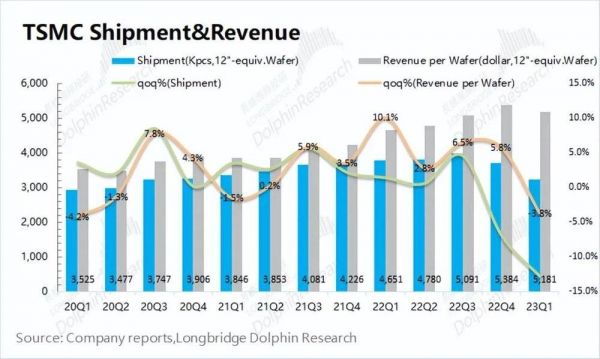 1)量的维度:2023Q1台积电的晶圆出货量3,227千片,环比下滑12.8%。台积电出货量在本季度出现环比下滑,主要是部分下游不景气导致客户订单调整影响所致。结合资本支出情况,台积电本季度的资本开支99.4亿美元,较上季度有所减少。公司此前对2023年的资本开支计划相对保守(320亿~360亿美元),当前仍保持资本投入的节奏。