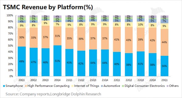 智能手机和HPC是台积电最大的收入来源,两者合计占比仍有78%,是公司最大的下游。