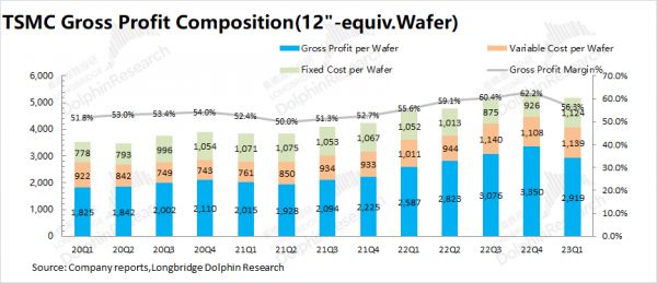 2)固定成本(折旧摊销):2023Q1台积电平均固定成本约1124美元/片,环比增加198美元/片。这是由于本季度出货量出现较大下滑,导致折旧摊销到单片晶圆的单位成本增加;