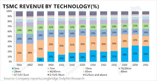从各地区收入来看,北美地区仍是台积电最大的收入来源。这是由于北美地区有苹果、高通、英伟达、AMD等大客户,使得台积电和美国之间有很强的商业绑定关系。但从本次财报看,北美地区的收入占比有明显的下滑,这主要是因为公司一些美国的大客户在本季度调整了订单,这也是公司营收下滑的主要因素。