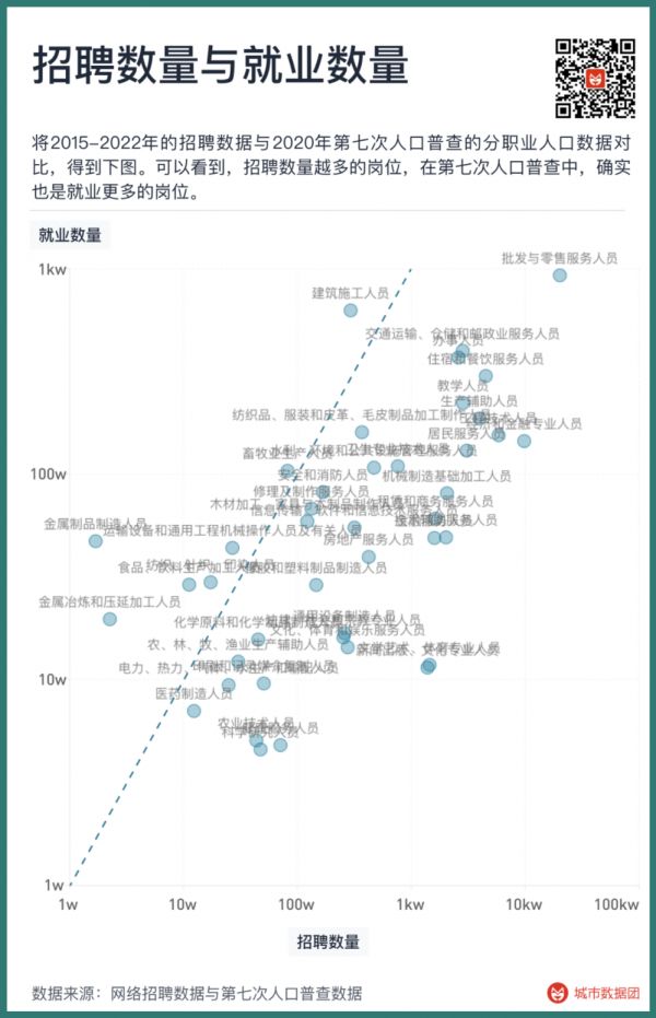可以看到,招聘数量越多的岗位,在第七次人口普查中,确实也是就业更多的岗位。个别岗位的就业数量高于招聘数量,特别是金属制品制造人员、建筑施工人员等;还有一些岗位比如新闻出版、文化艺术和体育专业人员的招聘数量高于就业数量,体现的是不同岗位在网络上进行招聘的不同倾向。蓝领岗位很少会在几大招聘网站上进行招聘,而白领岗位则相反。
