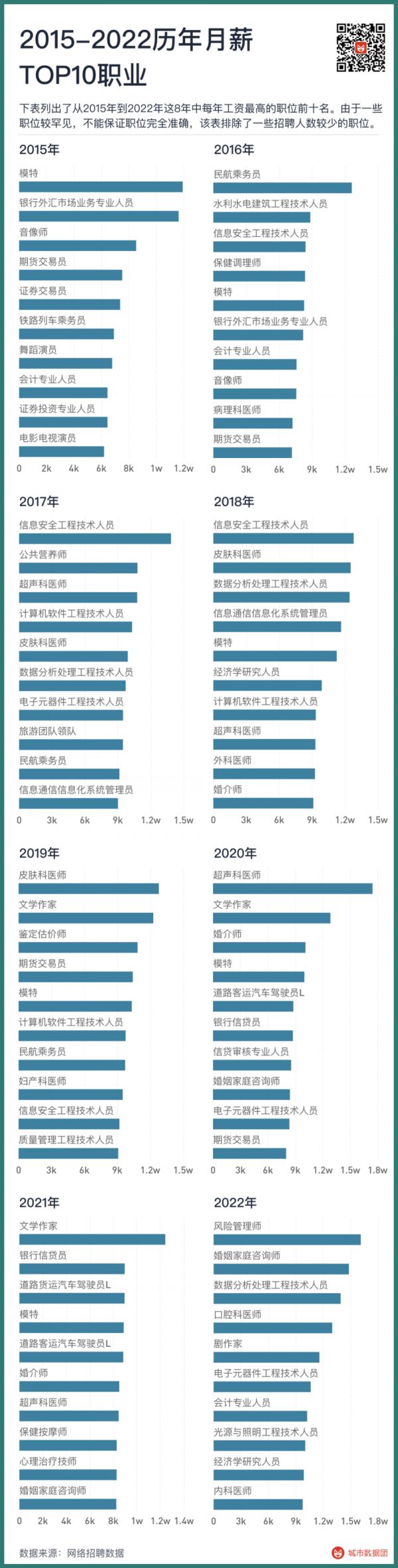 下表列出了从2015年到2022年这8年中每年工资最高的职位前十名。由于一些职位较罕见,不能保证职位完全准确,该表排除了一些招聘人数较少的职位。