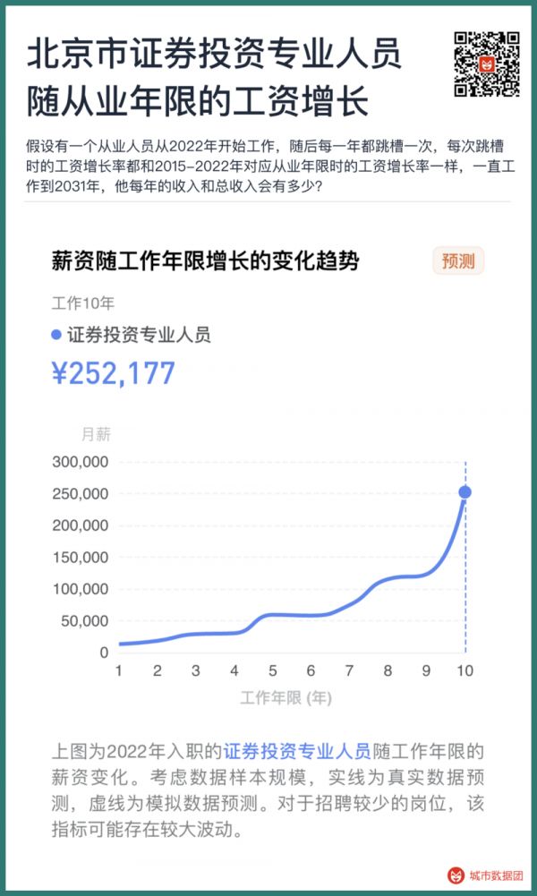 可以看到,在这样的计算方式下,一个2022年时入职平均工资为11681元的证券投资专业人员,每年跳槽一次,在2031年时的月薪就会高达12.3万元,这10年的工资总收入将高达639万元。