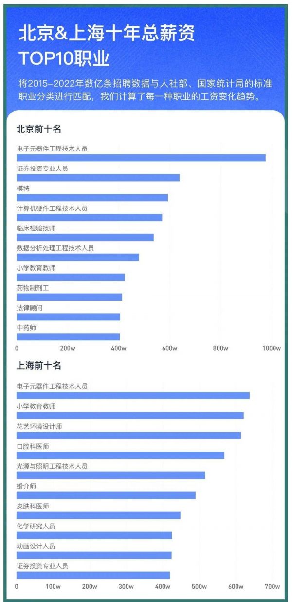 下表列出了北京和上海不同职位的十年工资总和前十名。可以看到,电子元器件工程技术人员虽然在本文表一中落后于模特、期货交易员、超声科医师和信息安全工程技术人员,但由于该职位随着工作年限的工资增长很快,他反而成为了北京、上海当仁不让的十年总工资第一名。考虑到电子元器件工程技术人员这个职位正是中国要在芯片上奋力赶超所需要的关键人才,他们的十年工资排名最高,似乎也并没有那么让人意外了。