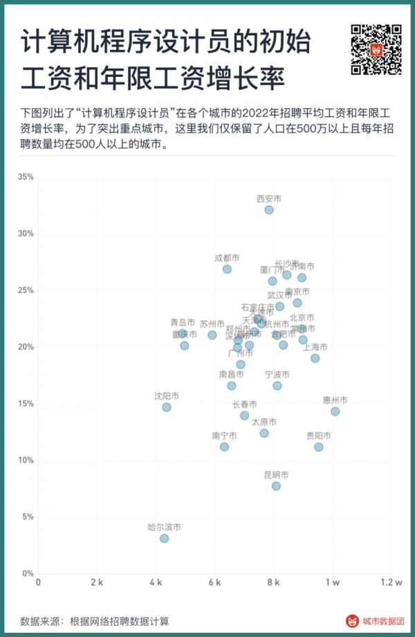 下图列出了“计算机程序设计员”在各个城市的2022年招聘平均工资和年限工资增长率,为了突出重点城市,这里我们仅保留了人口在500万以上且每年招聘数量均在500人以上的城市。