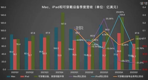 财报显示,一季度期间,Mac业务线营收为71.68亿美元,同比下降31%, iPad营收为66.7亿美元,同比下降13%。Mac和iPad在苹果整体营收中的占比,分别为7.6%和7.03%。