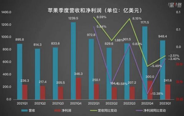 根据财报,在2023年一季度(截至4月1日的2023财年第二财季),苹果营收948.4亿美元,高于市场预期的926亿美元;净利润241.6亿美元,同样高于市场预期的226.6亿美元;毛利率为44.3%,同比提升了0.6%。