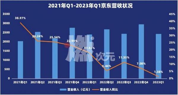 在2020年和2021年这两年疫情管控大背景下,京东年营收增速分别为29.28%和27.59%,2022年京东的营收增速掉了大半,仅为9.95%,不曾想,2023年一季度同比增速更是直接掉至1.38%,下滑的迹象十分明显。