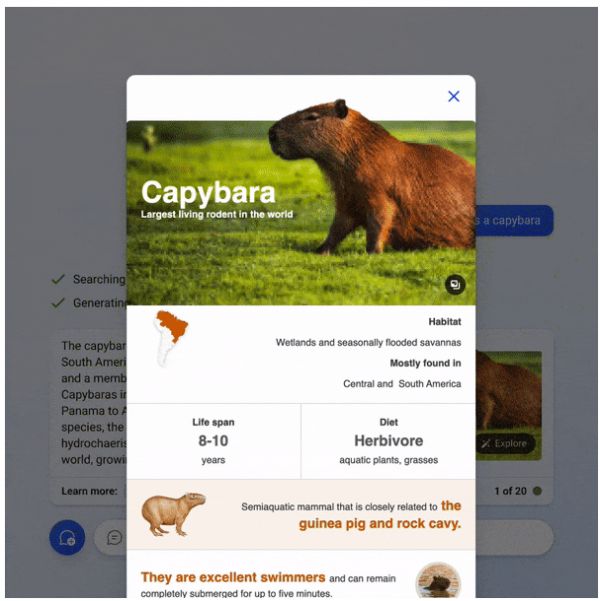 IT之家在此附上博文中的一个示例,如果你向必应聊天询问有关火烈鸟或水豚的问题,这些动物的图像将与你的答案一致。单击图像以启动知识卡,该知识卡可让您探索有关其栖息地,饮食,生命周期和其他事实的更多信息。