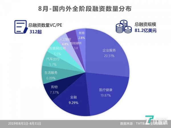 钛媒体旗下「潜在投资」给2019年8月做一个总结——企业服务、医疗健康、金融领域依然领跑前三,购物、汽车出行领域项目频出上亿元融资。从融资金额来看,投资机构依然偏好中后期的成熟项目。从融资数量上来看,国内呈现追赶国外趋势。