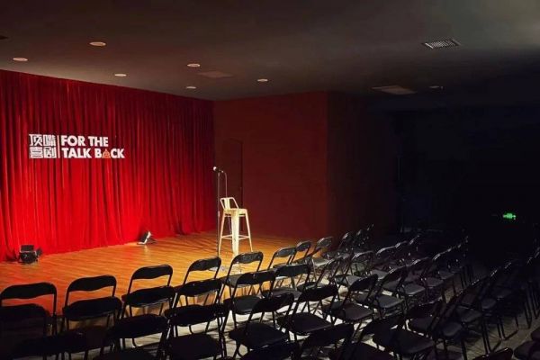 掀开红色的演出帘子,会看到一个100来平米的场地。红色帘子绕场半圈,中间布置着一个半圆形的木质舞台,上设一米多高的话筒,正中央打出厂牌名字:顶嘴脱口秀。角落里搭起一个黑色小空间,算是后台,道具杂乱地陈列其中。