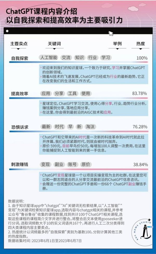我们以知识星球平台为例,总结了AI课程的商品描述。通过对课程描述的文本进行语义分析,我们发现“自我探索”类型出现次数最多,宽泛的行业交流和知识学习是每门课程都会打出的卖点;其次是效率的提高,这些课程宣称你将习得一门超级工具,无论工作或学习都有高效的应用前景;“恐惧诉求”的比例也占到76.28%,作为一种典型的说服技巧,它以敲警钟的方式告诫人们“再不学ChatGPT就要被时代淘汰了”;最后一类则将ChatGPT视为一片副业新蓝海,以种种变现手段刺激大众的致富心理。