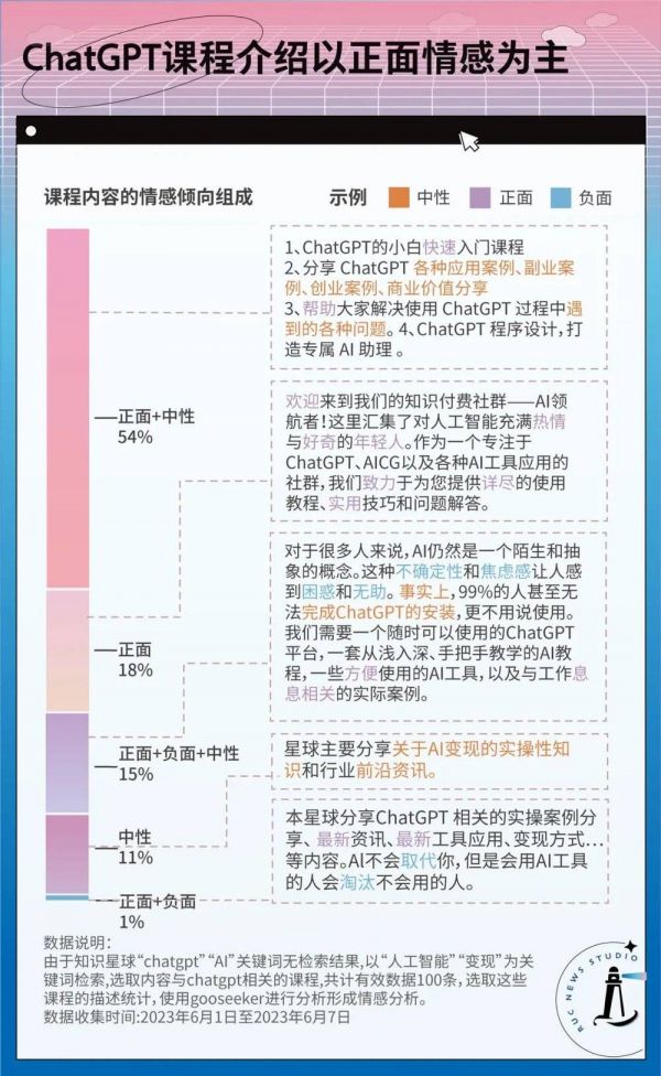 仍以定价普遍较高的知识星球内的相关课程为例,通过情感分析,我们发现ChatGPT课程主打正面或中性的情感风格。商家会强调其课程内容的前沿与实用、邀请的“业界大佬”如何资深以及对AI小白的友好门槛,并且用“帮助”“致力于”“热情”等词汇点缀课程社群的良好氛围。这些话术都让人产生一种“我上我也行”的感觉,似乎学习ChatGPT并不需要多少前置能力,新手也能快速驾驭。