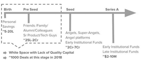 在2014-15年的资金热潮中,许多顶级风险投资公司,如赛富基金、经纬创投、红杉资本和Chiratae Ventures(前身为IDG风险投资公司印度分公司),在新创业公司的估值过高之前,已分别对它们进行了不到100万美元的种子投资。当时他们把重点放在A轮上,投资额度为300-500万美元不等。