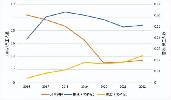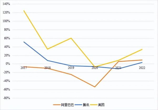 那么,这些变革达到预期了吗?并没有。我们看到的情况是,这些企业的大企业病反而越来越严重,效率反而越来越低了。数据不说谎,阿里巴巴的人效2016年开始急剧下跌,近两年才止住了颓势;腾讯和美团的人效则走势平缓,显然和其高速增长的业务并不匹配(如图1)。但换个更严苛的视角,三个大厂的人效增长率(即增速)都有所下降,仅近两年才略有反弹(如图2)。