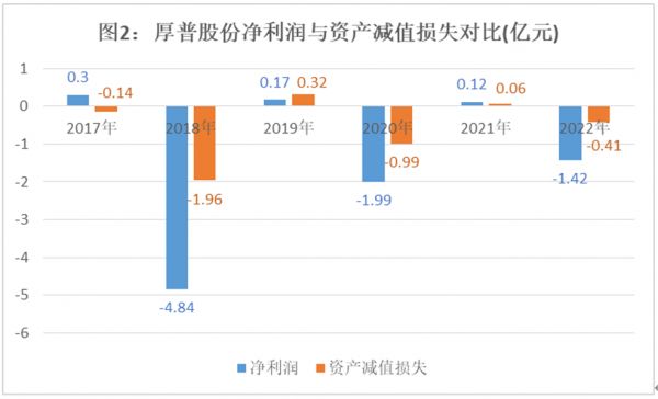 在亏损的2018年、2020年、2022年,资产减值损失分别为-1.96亿元、-0.99亿元、-0.41亿元,金额相对较高(图2)。也就是说,厚普股份的利润表现,与资产减值的高低呈现出强相关性。
