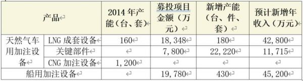 根据招股书,三个募投项目实施完成后,公司LNG加气站成套设备的产能将由此前的年产160套增加到340套,并新增LNG船用成套装置产能430套/年,新增天然气加气设备关键部件共计22220件、套/年。三大项目预计每年将新增销售收入近10亿元(表1)。