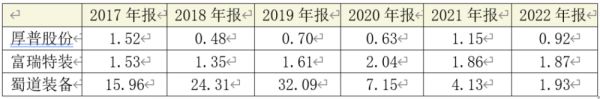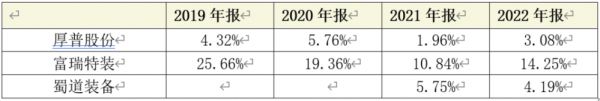 厚普股份的存货跌价准备计提比例,也要低于同行业上市公司。2022年,厚普股份存货跌价准备计提比例仅为3.08%,低于蜀道装备的4.19%,更低于富瑞特装的14.25%(表6)。