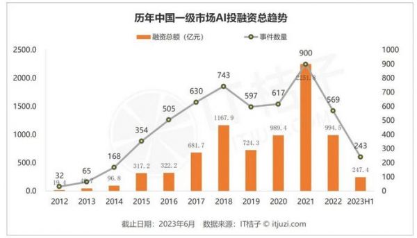 据创投数据服务商IT桔子统计,自 2012 年至今中国一级市场,即从初创到上市前的AI公司总融资金额有7862亿元,交易数量为5423起。梳理可发现,AI投融资兴于2017、2018年,商汤科技、云从科技、格灵深瞳等均在当时获得密集融资,并在2022年左右走向上市。而就融资总额和数量看,爆发高峰点在2021年,2022年AI 投融资金额和数量近乎腰斩。2023年上半年,尽管有AIGC、大模型带来的风口,但一级市场AI融资总额暂未回升。