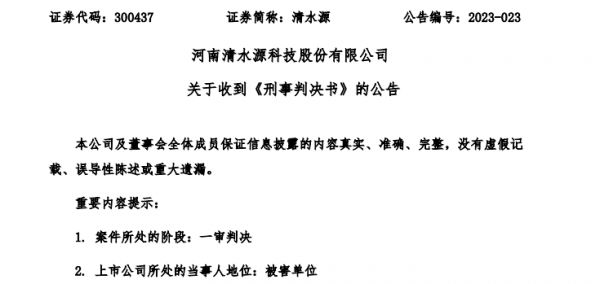 7月16日晚间,清水源发布公告称,近日收到河南省济源中级人民法院出具的《刑事判决书》。