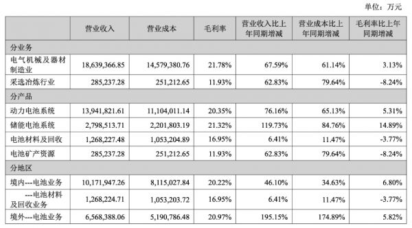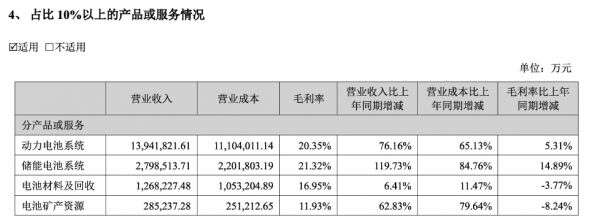 财报数据显示,储能电池业务营收为279.85亿元,毛利率为21.32%,相比上年同期均有较大幅度的增长。储能业务占到总营收的14.79%。