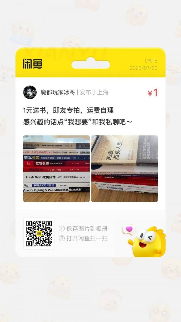 最后综合考虑到时间成本、知识流通、绿色低碳等因素,还是没舍得直接丢楼下垃圾桶。把原总价 650 元的八本书,以 1 元钱挂到闲鱼上,送给粉丝当福利了。