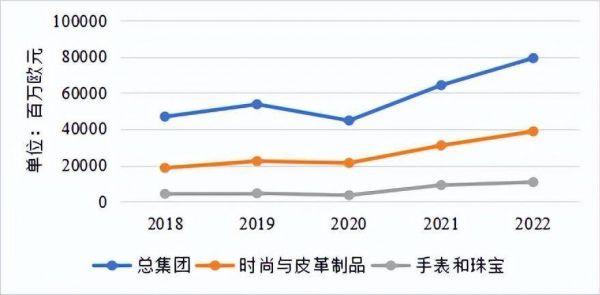 我们选取了LVMH集团总盘子与“时尚与皮革制品(占比最大)”“手表和珠宝”两项业务进行对比,分析其营收和利润率的变化趋势(如图1-2)。不难发现,“手表和珠宝”业务在营收和利润率上是最低的,且走势太过平缓,可以说严重拉低了集团的财务表现。既然如此,相对于“时尚与皮革制品”这类营收和利润都异常优秀的业务,“手表和珠宝”业务存在的意义是什么呢?