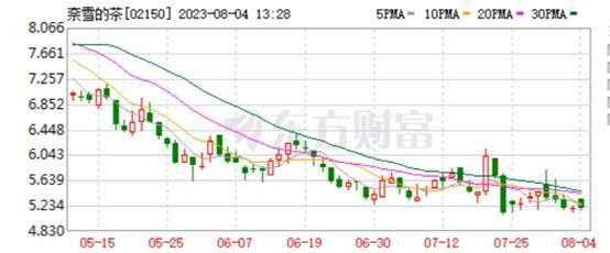 奈雪的茶于 2021 年 6 月在港交所挂牌上市,但自上市以来其股价一路向下,截至 8 月 4 日,奈雪的茶股价跌至 5.190 港元 / 股,总市值 89.02 亿港元,相较于上市之初,两年间股价累计大跌近 70%,市值下跌近 200 亿港元。