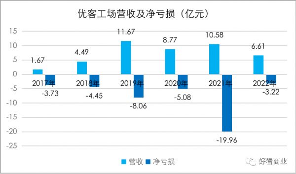 亏损与营收齐飞,甚至亏损多于营收也是优客工场成立以来的常态。2017~2022年,优客工场共录得净亏损44.5亿元;同期,其总营收为43.79亿元。基本保持了获得1块钱营收,亏1块多钱的状态。