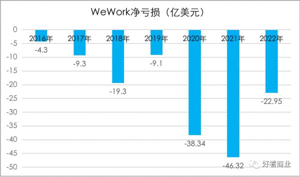 持续亏损是WeWork的常态,甚至可以说,它成立至今,盈利是不存在的。从披露过的数据看,2016~2022年,它共亏损了149.6亿美元。