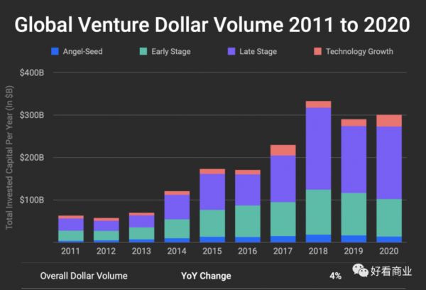 Crunchbase数据显示,2020年,全球风险投资同比增长4%,达到3,000亿美元;2011年时,总规模不足1000亿美金。