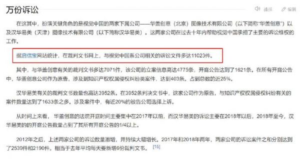 据启信宝网站统计,在裁判文书网上,与视觉中国系公司相关的诉讼文件多达11023件。