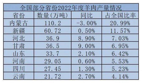 2022年河南羊肉产量排名全国第六 数据来源:国家统计局