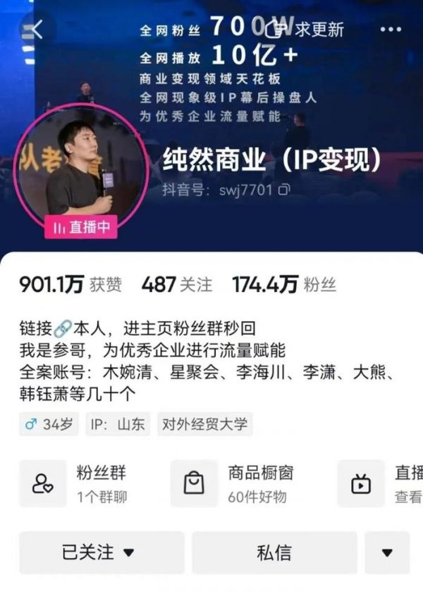 比如近日有着200多万粉丝的“参哥认知圈”被抖音封禁后,海参哥在“纯然商业(IP变现)”账号仍然正常直播,似乎并没有受到丝毫影响。