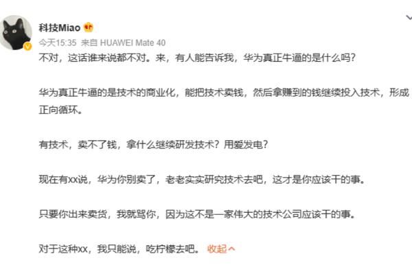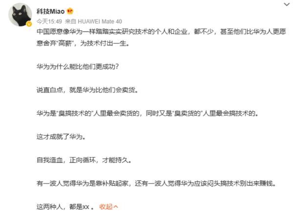 有博主发文表示:华为真正牛逼的是技术的商业化,能把技术卖钱,然后拿赚到的钱继续投入技术,形成正向循环。有技术,卖不了钱,拿什么继续研发技术?用爱发电?中国愿意像华为一样踏踏实实研究技术的个人和企业,都不少,甚至他们比华为人更愿意舍弃“高薪”,为技术付出一生。华为为什么能比他们更成功?说直白点,就是华为比他们会卖货。华为是“臭搞技术的”人里最会卖货的,同时又是“臭卖货的”人里最会搞技术的。这才成就了华为。自我造血,正向循环,才能持久。有一波人觉得华为是靠补贴起家,还有一波人觉得华为应该闷头搞技术别出来赚钱。这两种人,都是xx 。
