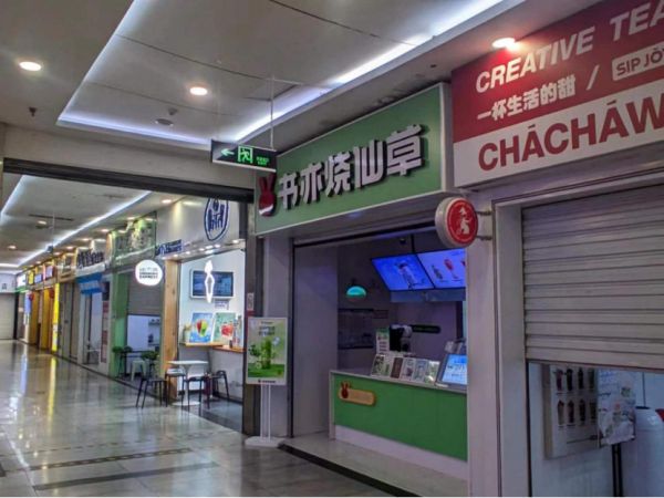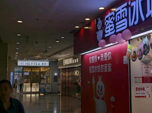 我们采访到了一个蜜雪的加盟商,喜茶就开在蜜雪隔壁不到五米的地方。而且蜜雪做的早,地段比较靠近商场门口。喜茶店面位置本来只是一个档口,为了符合喜茶加盟商面积要求,又向后搭建了五米,增加了成本。不过店主表示,喜茶的品牌影响力还在慢慢增长,作为一个长期生意这点成本不算什么。