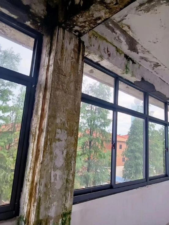 赵丽一家几口人住的三层中式楼房,经过三十年的风吹日晒,一到梅雨季节,就是一副“外面下大雨,屋里下小雨”的景象。赵丽多次向村里申请维修,但是迟迟未有音信。一到梅雨季,她总要在三层地板放几个盆子,以免雨水侵蚀地板。如今,走进这栋老房子,能够清晰闻到墙体散发的霉味儿。管道、梁柱开裂,引发墙面和水泥地面到处可见弯曲的裂痕。三层屋顶,由于雨水的侵蚀,白色墙壁上爬满墨绿色霉斑。