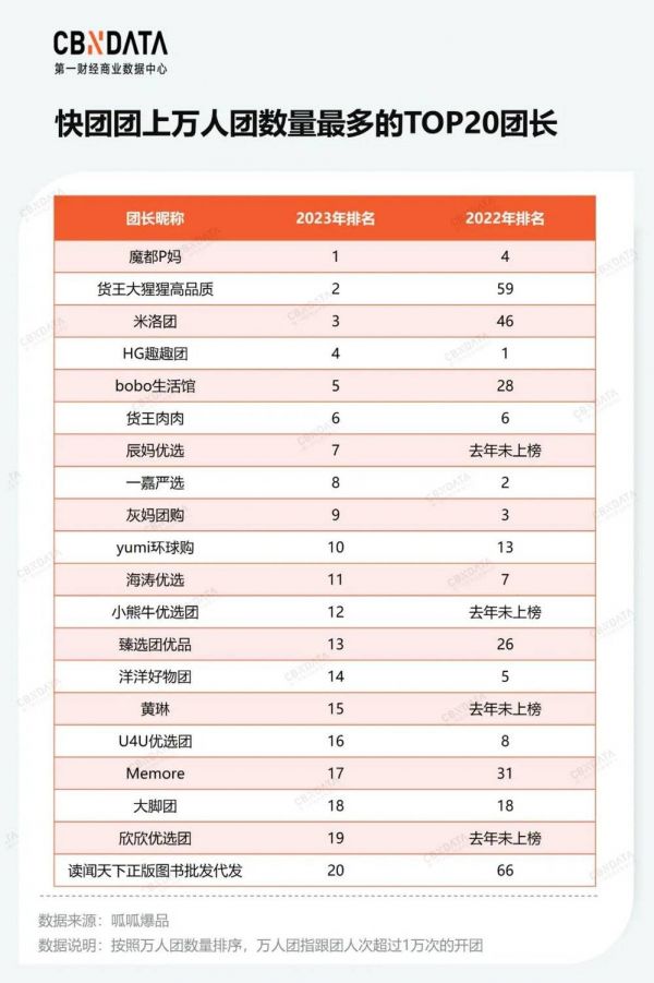 不同环节界限模糊,也意味着角色之间没有绝对的护城河,帮卖团长只要做得足够大,就能取代更上游的开团团长。这一点从快团团头部团长的变迁也足以看出,2023年以万人团数量来排序的TOP20头部团长中,有5位2022年排名在30名之后,有4位甚至未上榜。