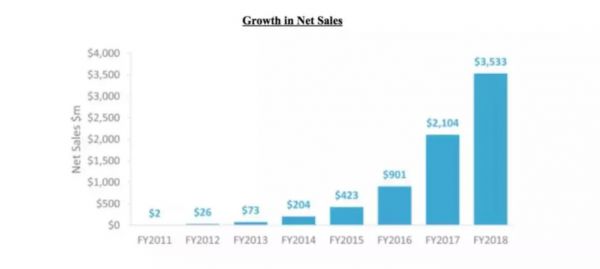 从2017 财年到2018 财年,自主品牌净销售额增长136.4%,约占公司净销售总额的5.3%。