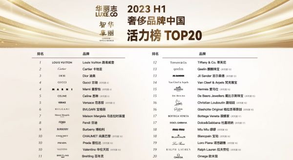 根据华丽智库发布的《2023H1奢侈品牌中国活力榜白皮书》,根据品牌更新动态,LV、卡地亚、迪奥、Gucci、Marni分别位列活力榜单TOP5。