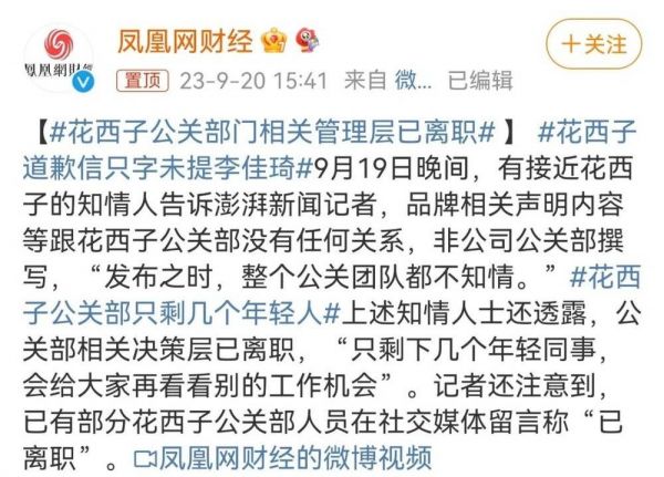 一天时间内,负面舆情还在持续发酵,“花西子自称是地地道道的国货”、“花西子道歉不够真诚不够实在”、“花西子道歉信无需反复强调自己是国货”等负面话题词相继登上热搜。同时,今天,大量关于本次危机公关操盘手的探讨出现,有业内知情人士向中新经纬表明,花西子本次的公开信并非出自其公司公关部,同时,公关部已有员工主动辞职,团队或将面临集体大换血。