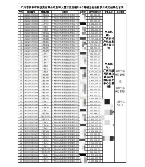 上述成交价在此次拍卖中只属于中位,根据9月19日广州农村产权交易所有限公司发布的出租项目成交结果,成交价格最高达到525万元,也是唯一超过500万元的成交价。据时代财经梳理,这些成交商铺中有超过130个的成交价超过200万元,过百万的超过250个,占比近五成。另有约20个商铺的成交价格不超过10万元。