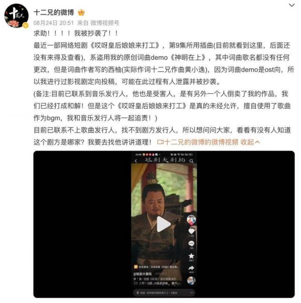 最近微博音乐博主“十二兄”发博表示,《哎呀!皇后娘娘来打工》第9集插曲疑似盗用了他的原创词曲demo《神明在上》。他进一步解释称,这首OST向demo曾被他拿去进行影视剧定向投稿,它很可能在此过程中被泄露并被挪为它用。