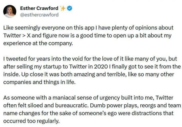 Esther Crawford的背景非常特别,她自己创建的公司在几年前被推特公司收购,然后成为了公司产品总监。之后,随着推特被马斯克收购,她又有了大量和马斯克一起近距离共事的机会。