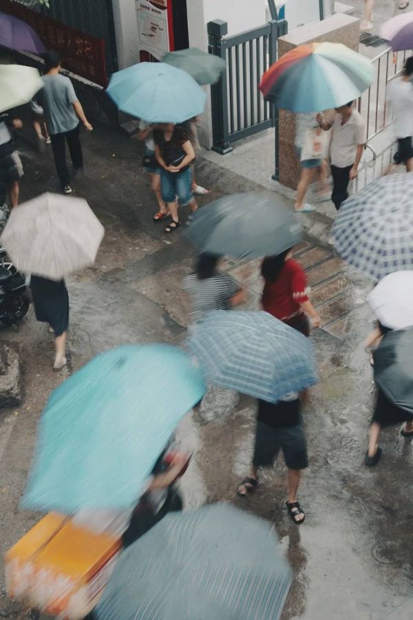 走过雨后街头的年轻人